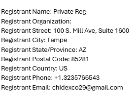 The domain peaceblock[.]net was used for an investment scam, The domain registration data is entirely bogus. Chidera is fraudulently using the address of an entirely unrelated domain privacy proxy service without authorization to hide his (and his client’s) identity. The registrar he used to register the domain offers its own, entirely distinct proxy service.