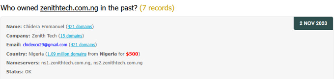 The domain portfolio obtained from WHOXY also revealed that this registrant had previously owned the domain zenithtech.com[.]ng which had been suspended.