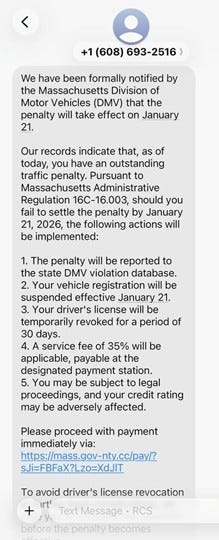 I could tell right away that it was a fake phishing attempt. The Mass. DMV doesn’t send threatening text messages, nor do most any DMVs or RMVs in the US. Secondly, if you take a close look at the URL in the message, the domain name part of the URL is “mass.gov-nty.cc”. This name composition is a not-so-subtle attempt to look enough like the state’s official domain, “mass.gov”, to fool someone into clicking that URL. I did not, but if I had, I’m sure that it would have looked a lot like an official website. Of course, any credit card info I submitted to such a site would have exposed me to any amount of fraud. And I may have unintentionally downloaded malware onto my phone.